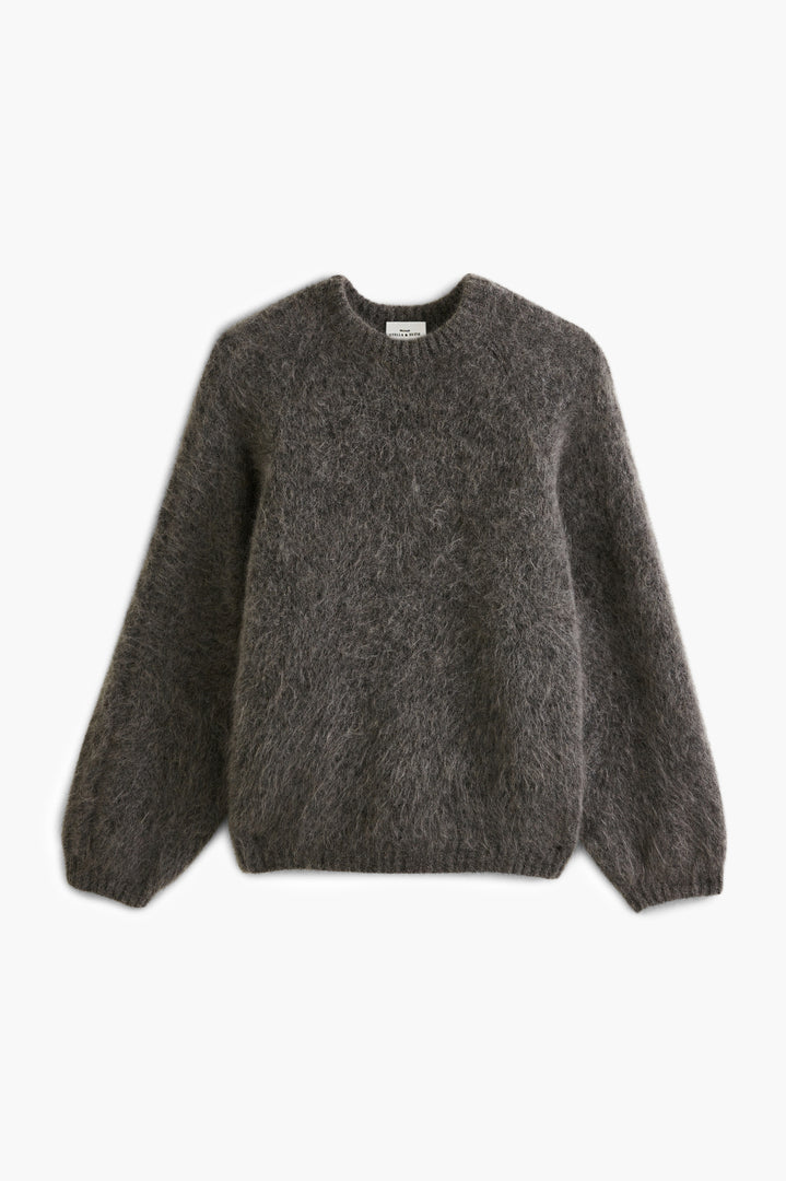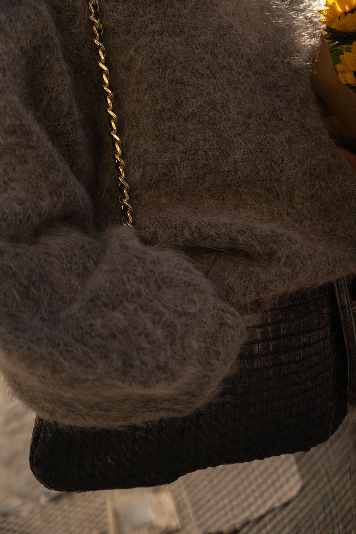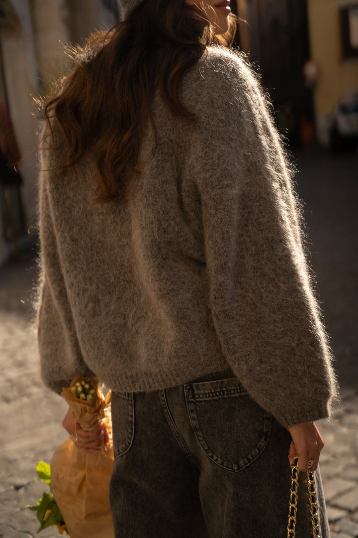 Incredibly soft, it's crafted from a fluffy knit of mohair and alpaca. With its raglan sleeves adorned with braids, it promises femininity and originality. We love its modern, oversized cut, which slips on easily to complement our everyday looks.