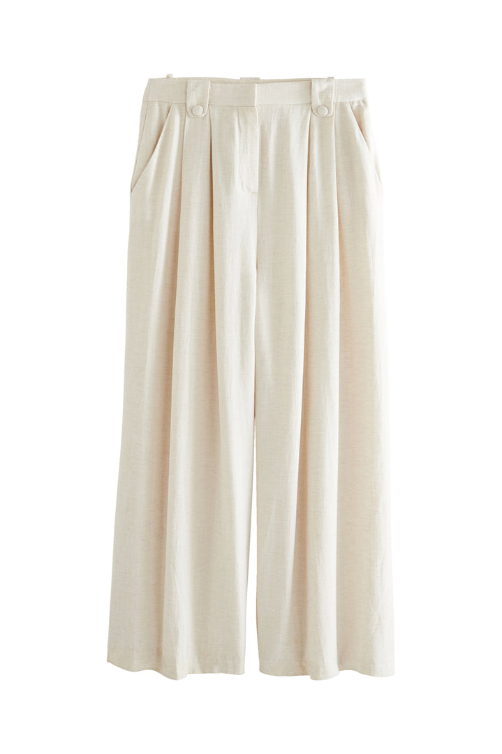The codes have been preserved: a high waist structured by flat pleats, three wide belt loops with covered buttons, and a long, flowing leg with a perfect fit.