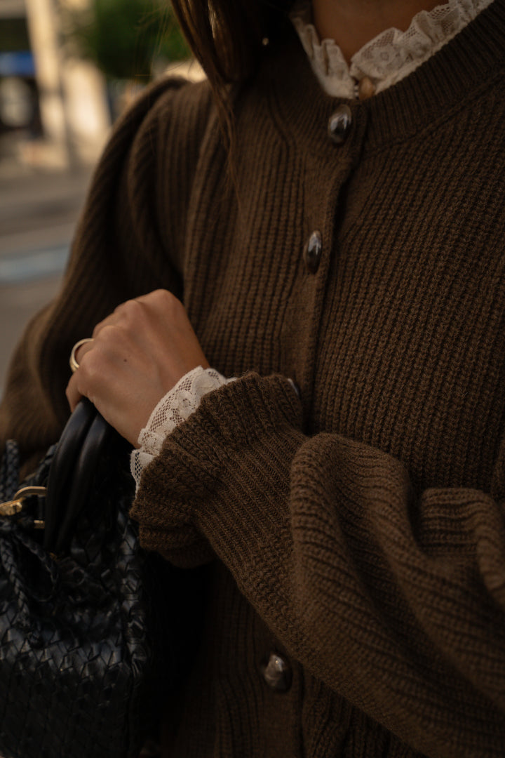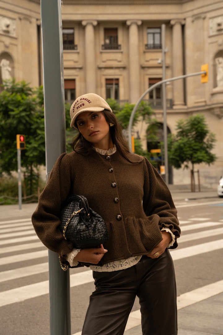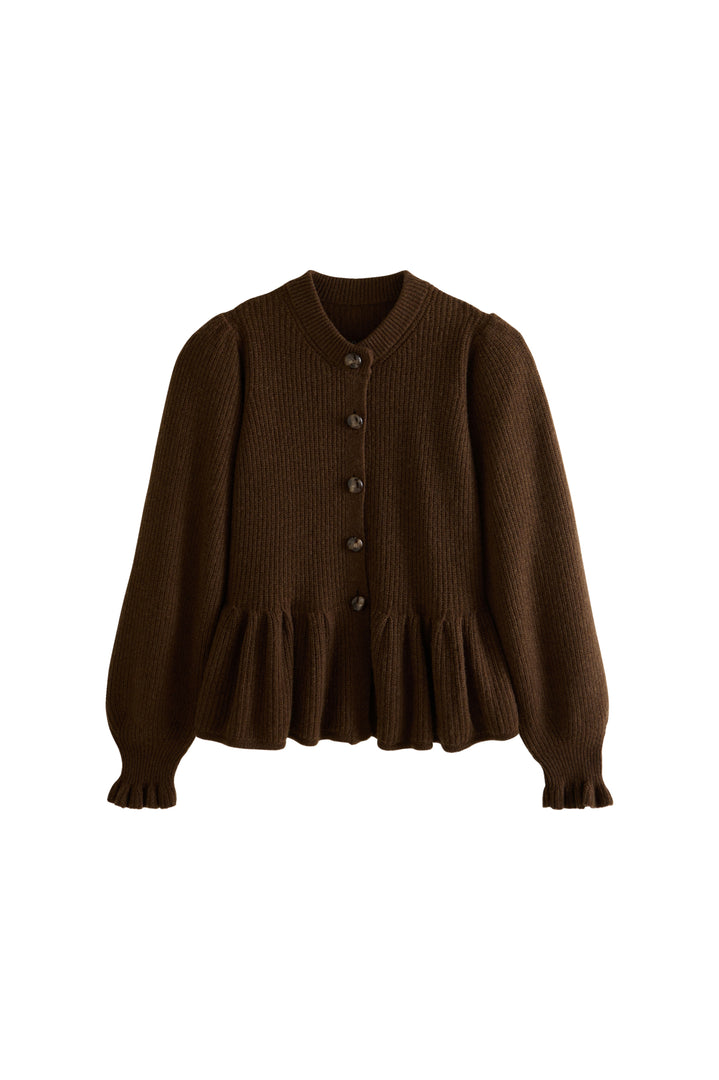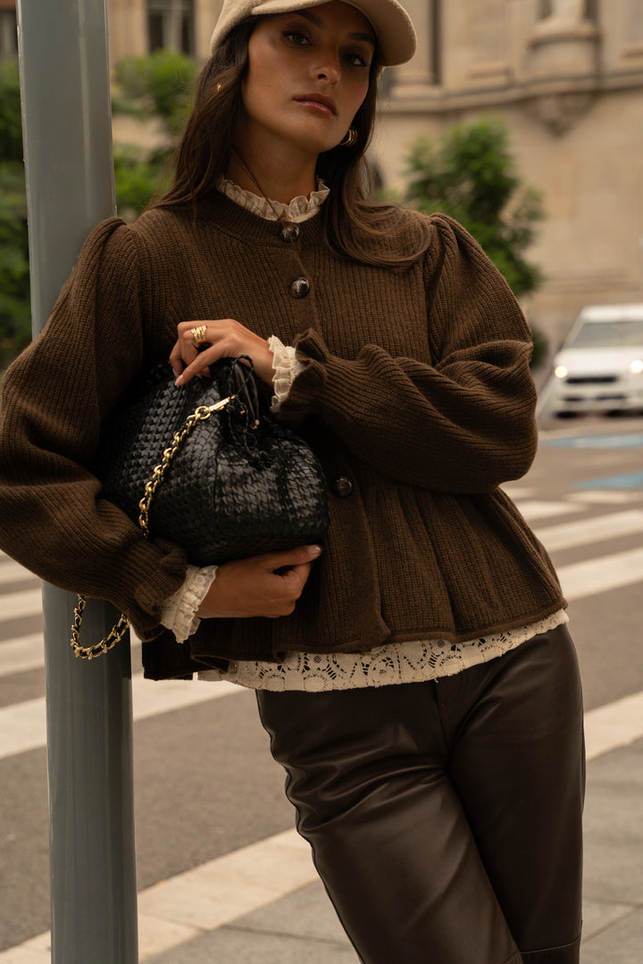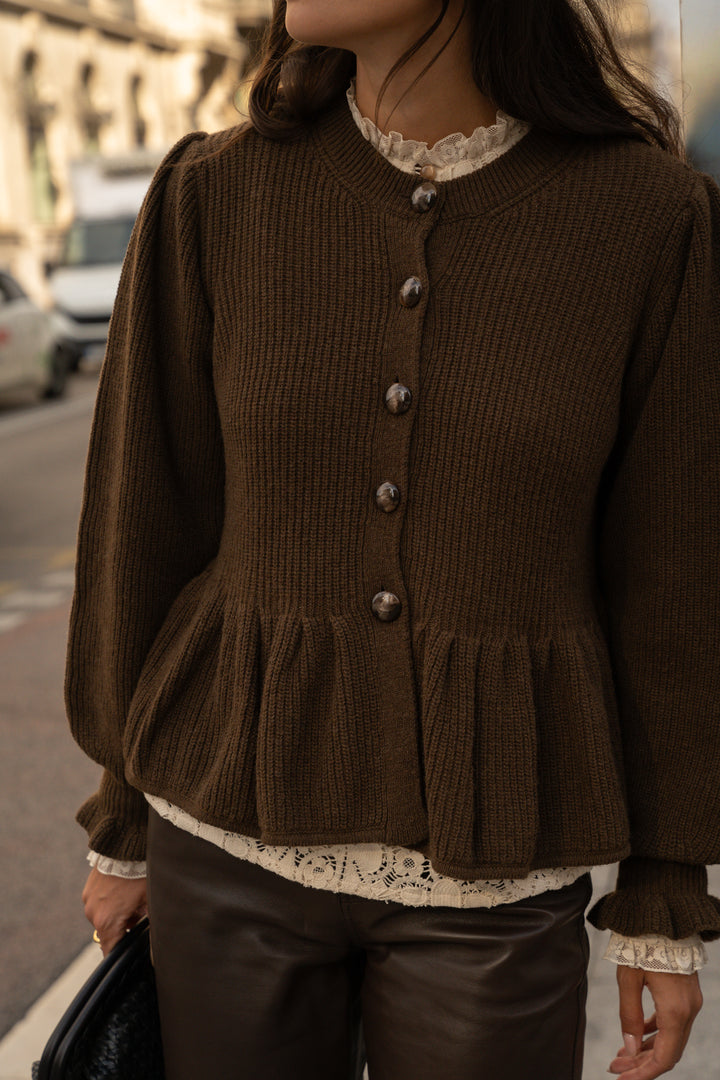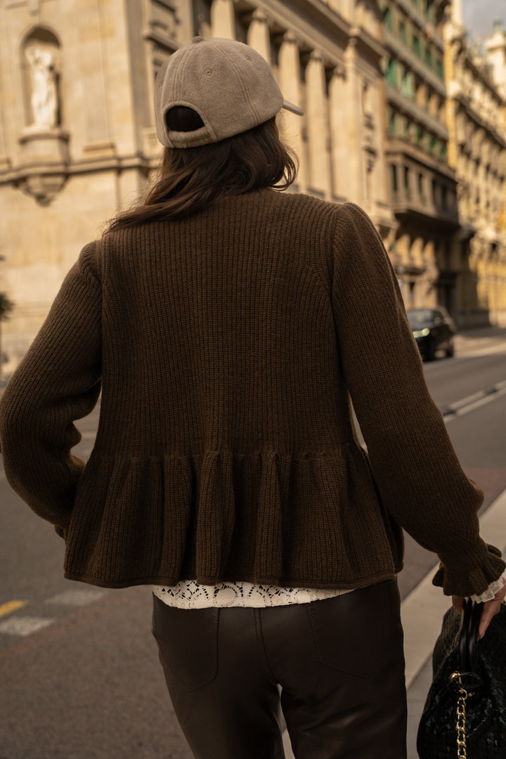 Its peplum effect adds volume to the silhouette, while its puffed sleeves, formed by small pleats at the shoulder, are tightened by a delicate rib and a ruffle at the bottom of the sleeve. The neckline and front center are outlined with a fine rib, enhanced by horn-effect ball buttons that give it an elegant finish.