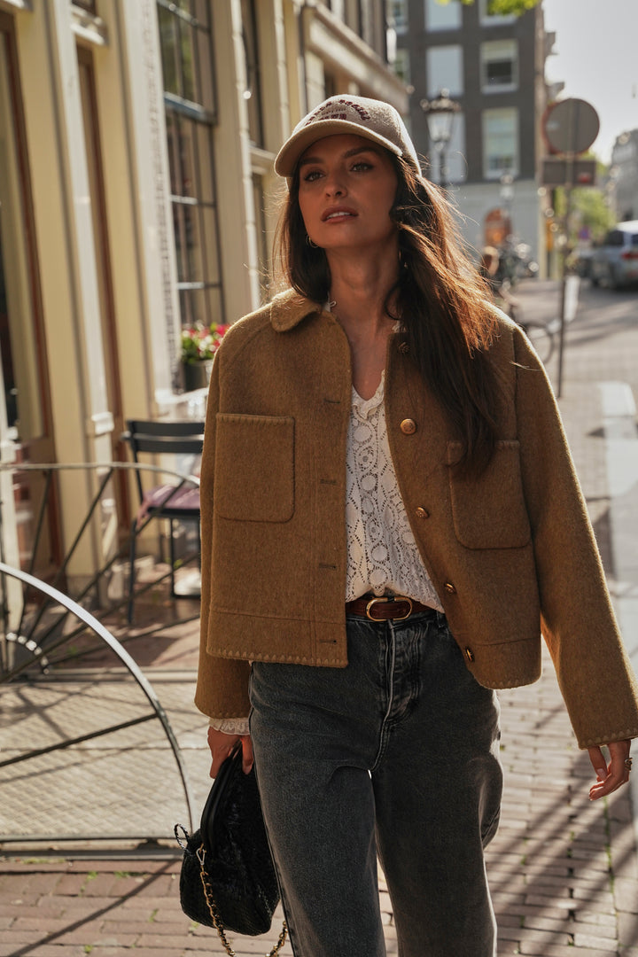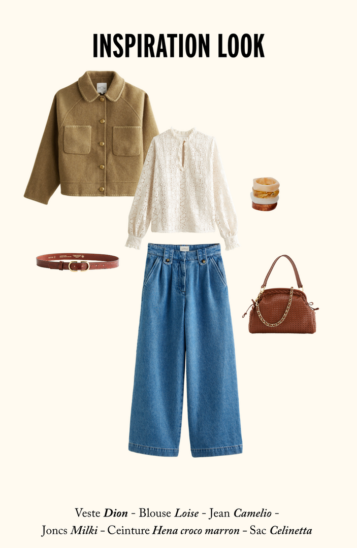 Ya sea para un look casual o más elegante, de día o de noche, esta chaqueta se convertirá en tu prenda imprescindible. A nosotros nos encanta especialmente con nuestra blusa Loïse de guipur color crema, combinada con unos vaqueros de corte ligeramente ancho para añadir un toque de modernidad.