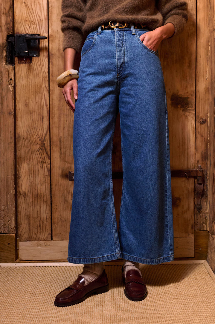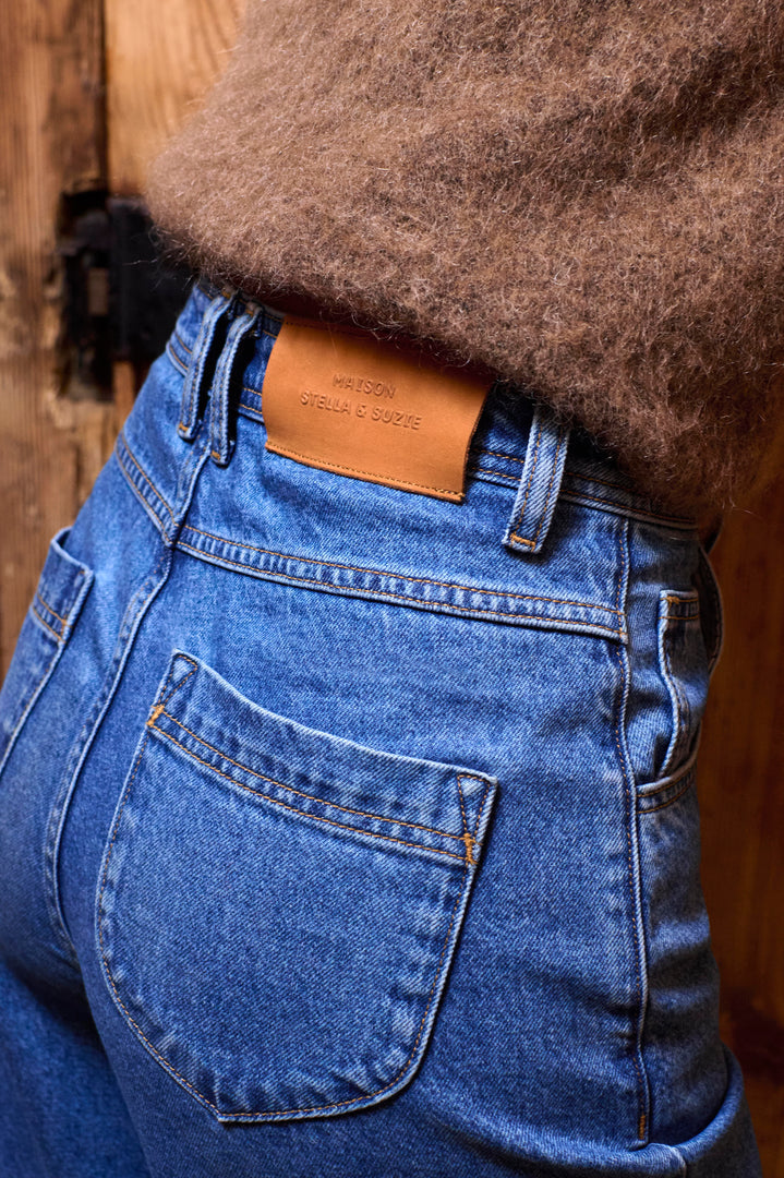 Los nuevos jeans de la Maison Benji ofrecen una silueta esbelta y sofisticada gracias a su pierna ancha. Fácil de combinar con una blusa o un suéter sin espalda, se convertirá en un imprescindible en tu armario.