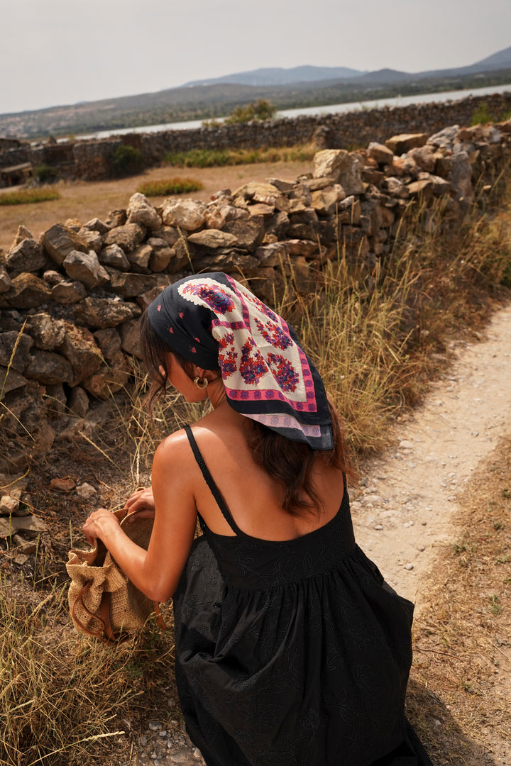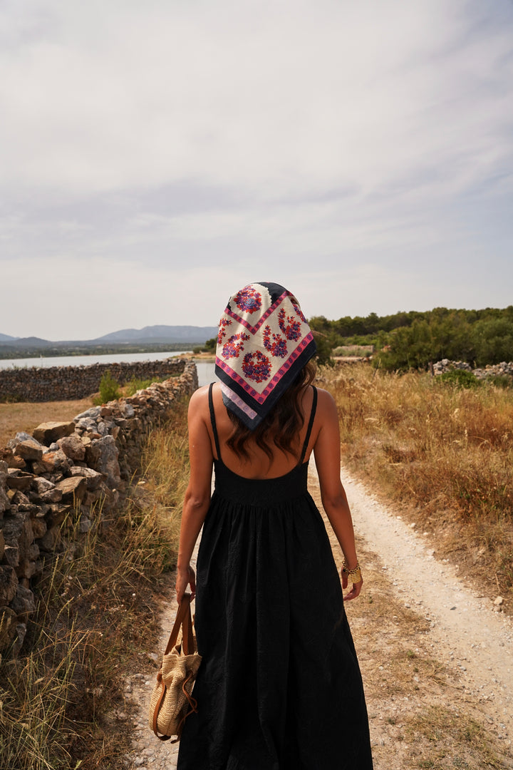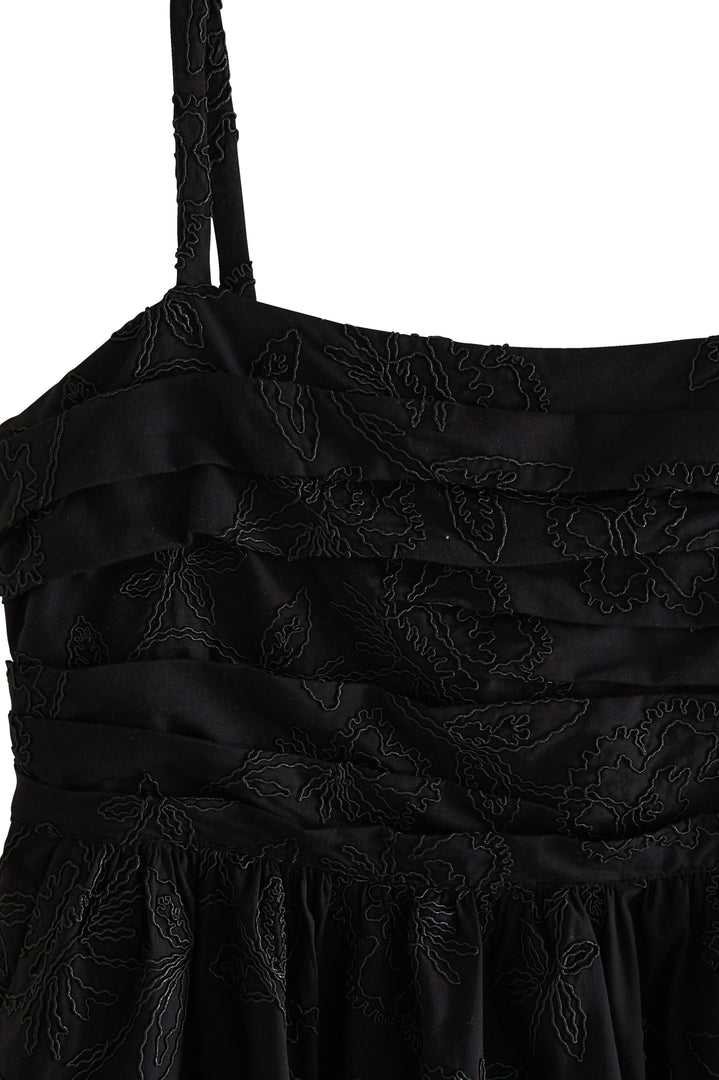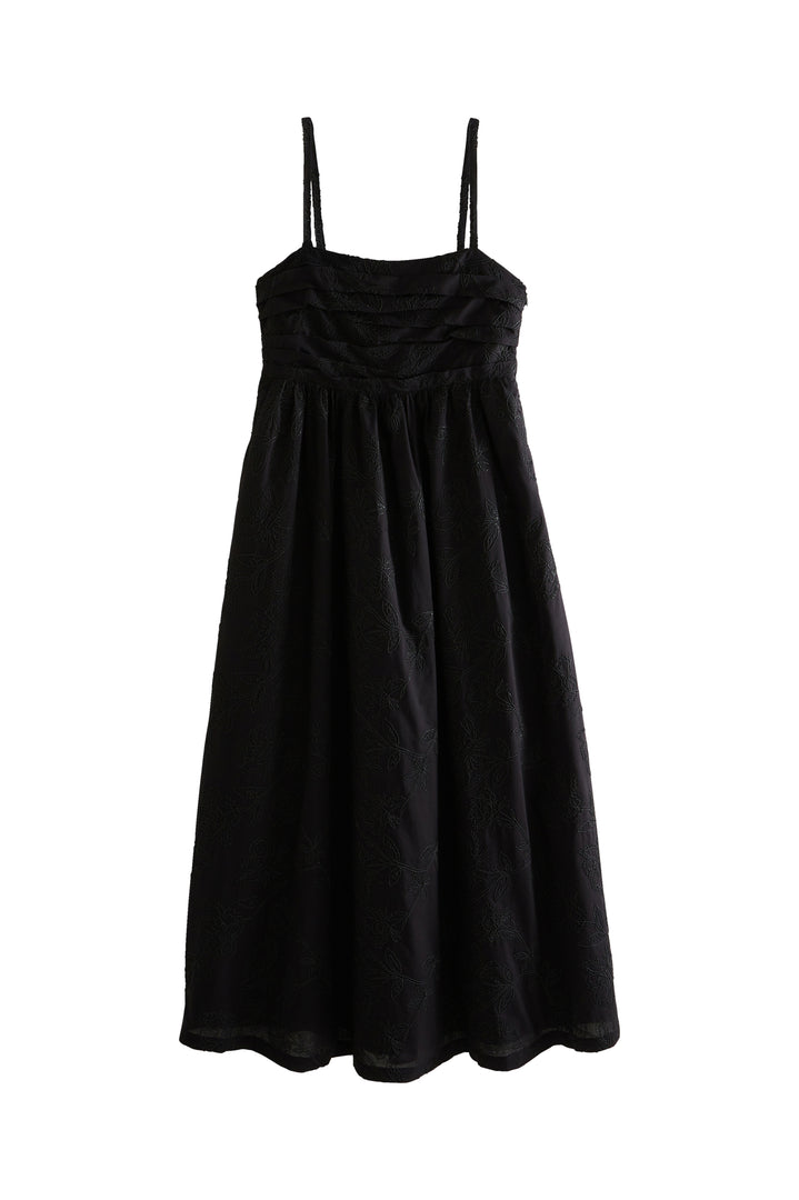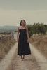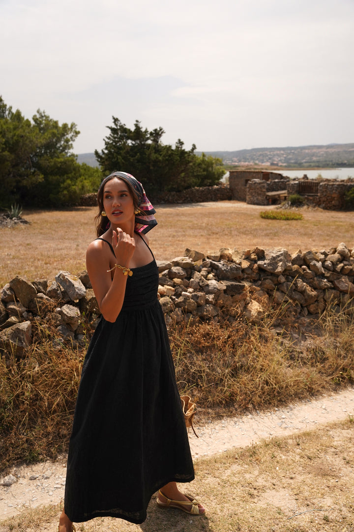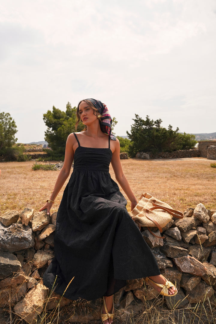 Este vestido largo de tirantes finos encarna una feminidad sutil y natural. Su espalda de bailarina, delicadamente dibujada, aporta un toque femenino, mientras que un trabajo de pliegues planos y redondos estructura el pecho con finura. ¿El detalle que enamora? Sus delicados acabados en soutache tono sobre tono.