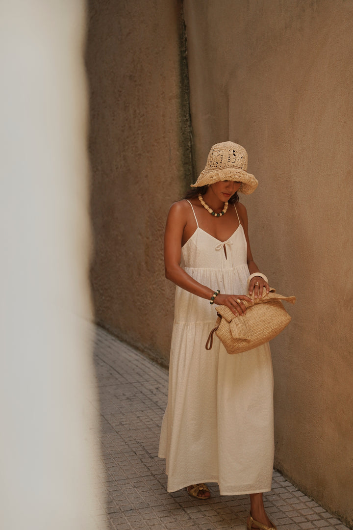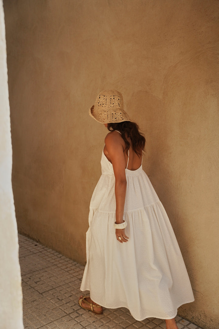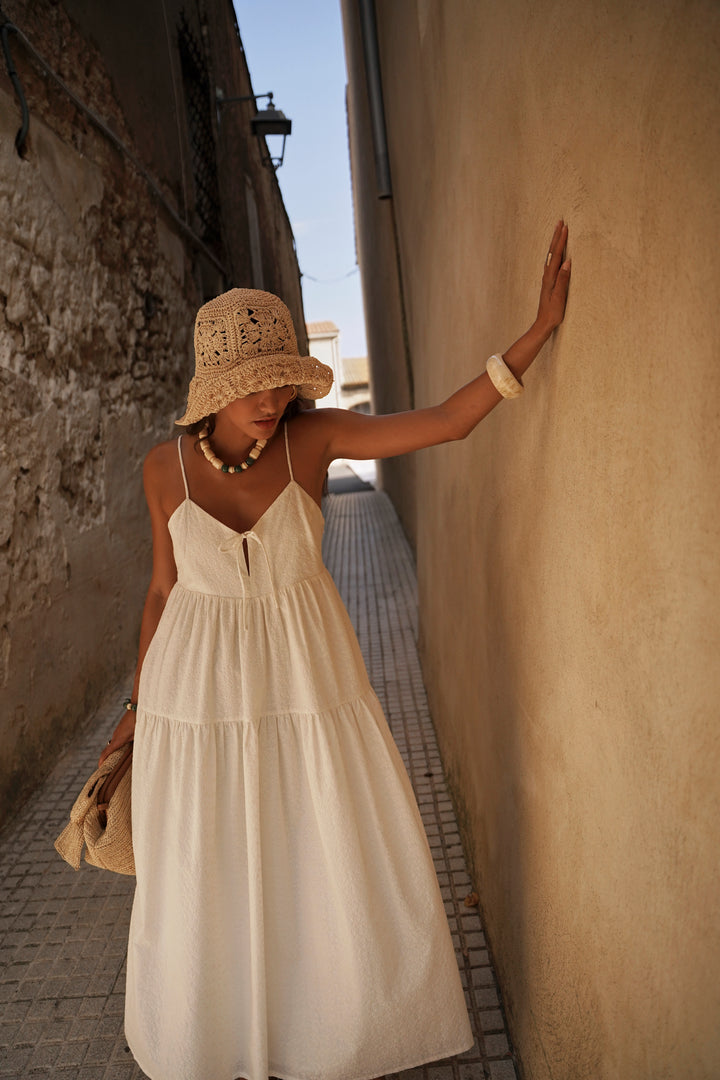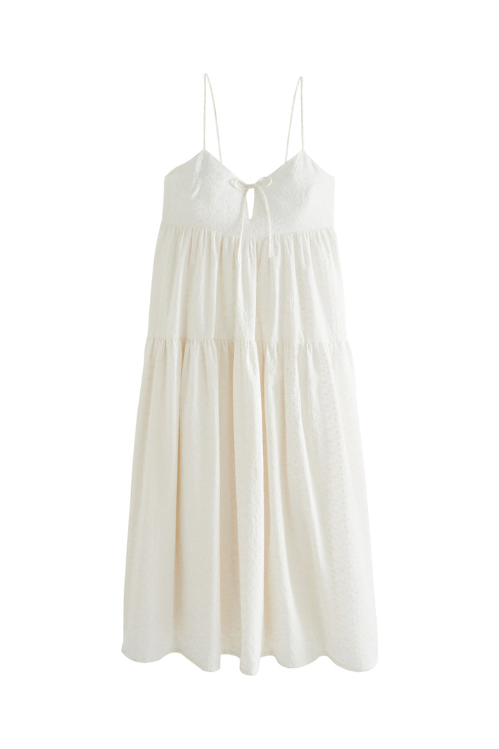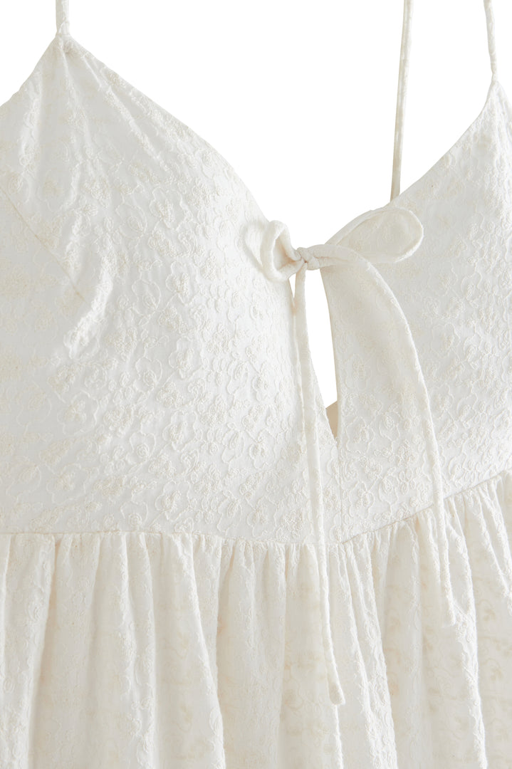 Confeccionado íntegramente en algodón, su tejido texturizado y su corte fluido realzan sutilmente la silueta, para un look natural, ligero y lleno de encanto.