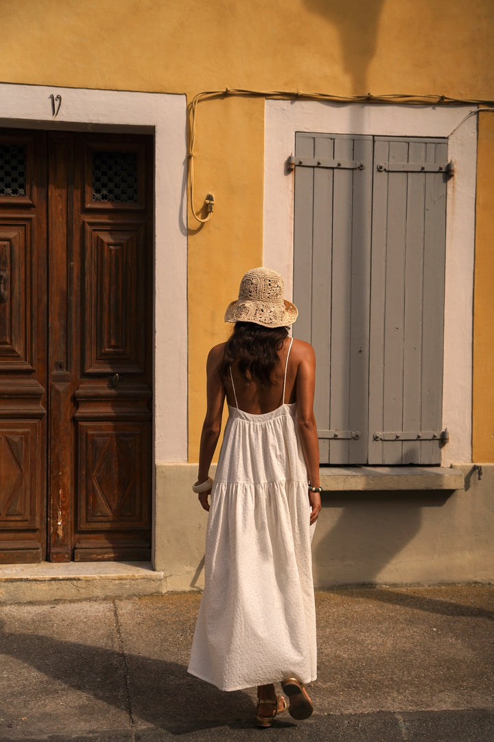 Su delicado bordado tono sobre tono ha sido diseñado para acompañar tus días soleados más hermosos. Con sus finos tirantes, su pequeño lazo en el pecho y su cremallera invisible en el lateral, ofrece una caída impecable con total suavidad.