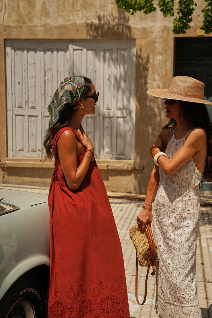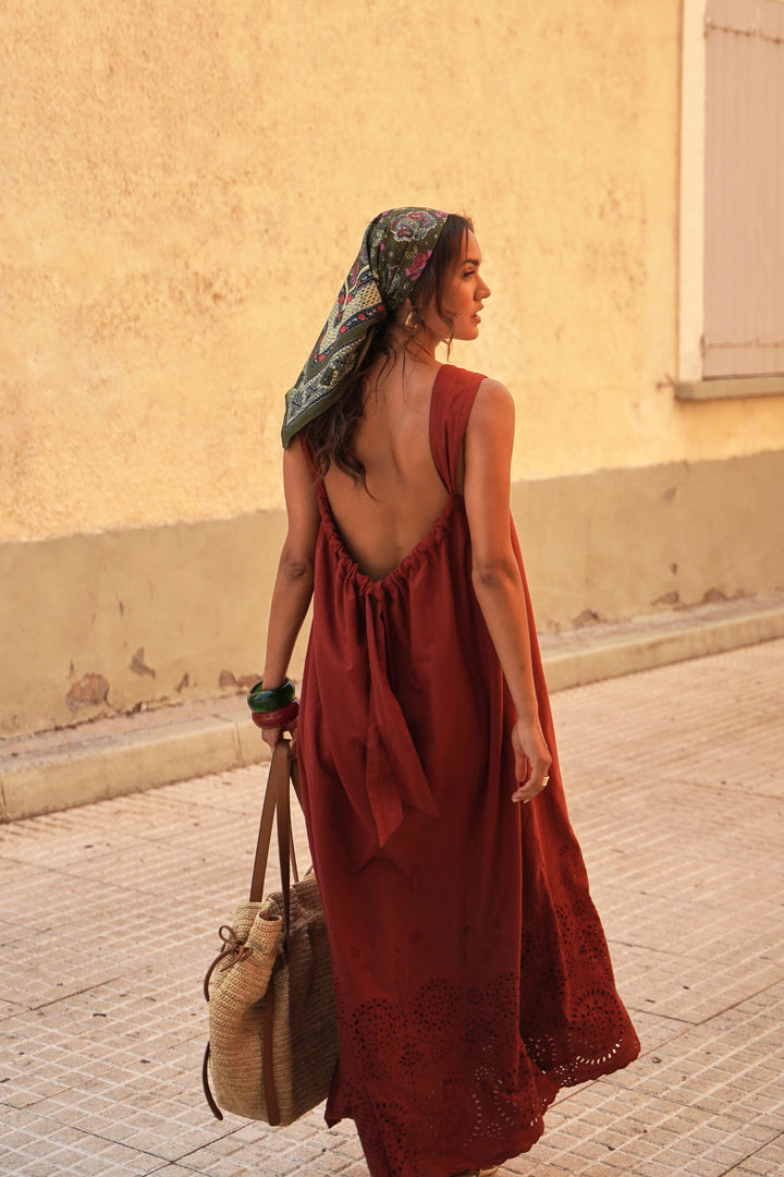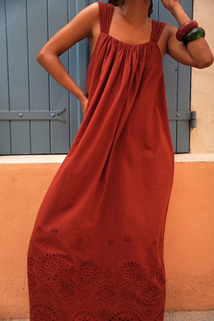 Delicadamente bordado en la parte inferior de la pierna, revela toda la delicadeza y suavidad de los días y noches de verano. Su corte holgado proporciona una hermosa fluidez, mientras que los tirantes que se atan en la parte inferior de la espalda permiten ajustar el vestido a tu figura. Hecho íntegramente en algodón, garantiza comodidad y ligereza durante todo el día. Su corte fluido y sus sutiles detalles lo convierten en una prenda fácil de llevar, tanto para un día informal como para una noche de verano.