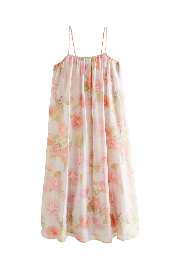 Su tejido fluido acaricia la piel con ligereza, mientras que sus tirantes trenzados realzan el escote, tanto por delante como por detrás. Una silueta femenina y libre, ideal tanto para los días soleados como para las largas noches de verano.