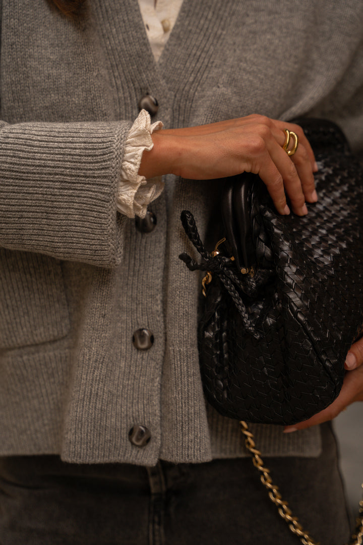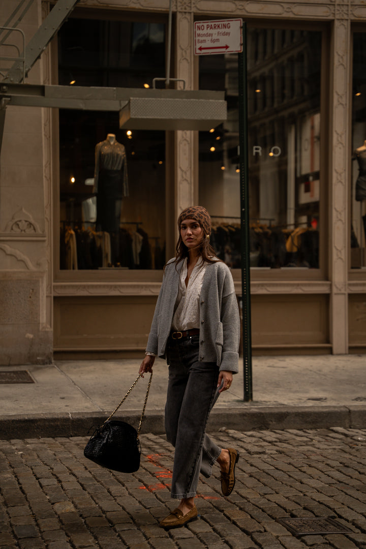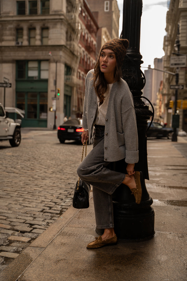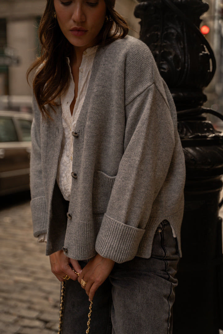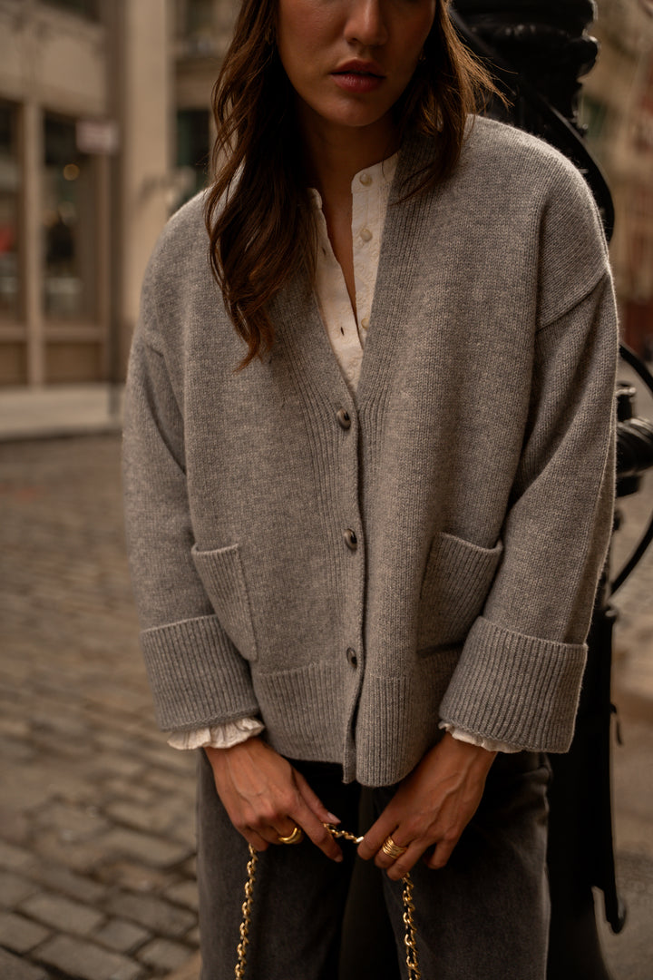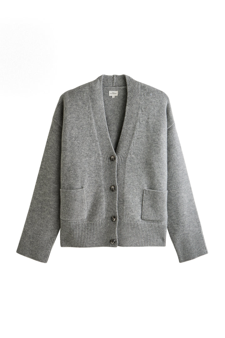 El cárdigan Luis se presenta en un gris jaspeado que resulta a la vez moderno y cálido.