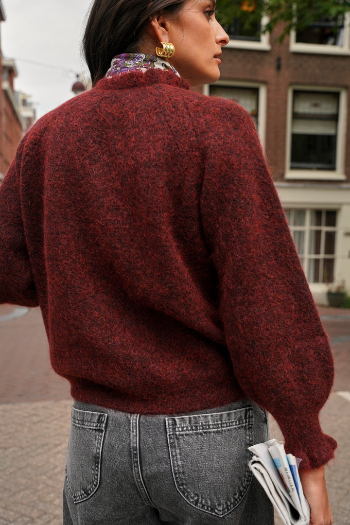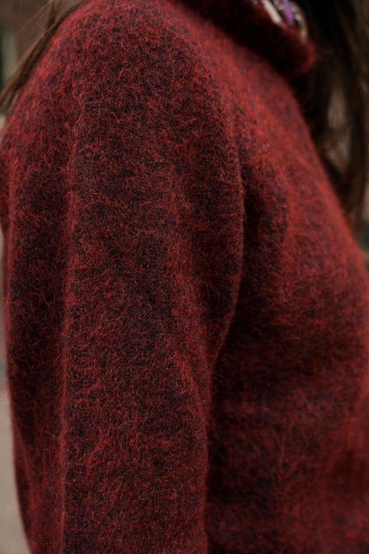 Entièrement confectionné en Italie, cette pièce pensée dans une maille bordeaux légèrement chinée, nous séduit tant par sa qualité que par ses détails féminins.