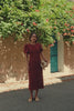 Au dos, une large échancrure dévoile subtilement la peau tout en finesse, tandis qu'une fente discrète au bas des jambes accompagne la démarche pour plus de confort.