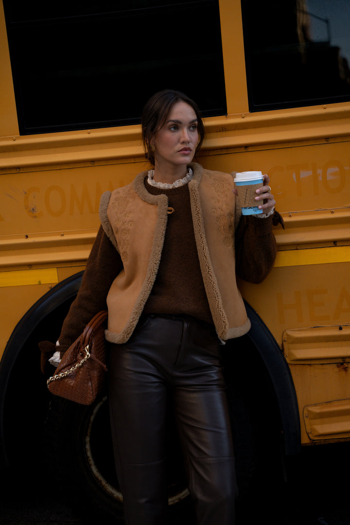 Pour un look d'automne comme on les aime, on le porte avec le pantalon en cuir marron Roger et la peau lainée sans manches Iker.