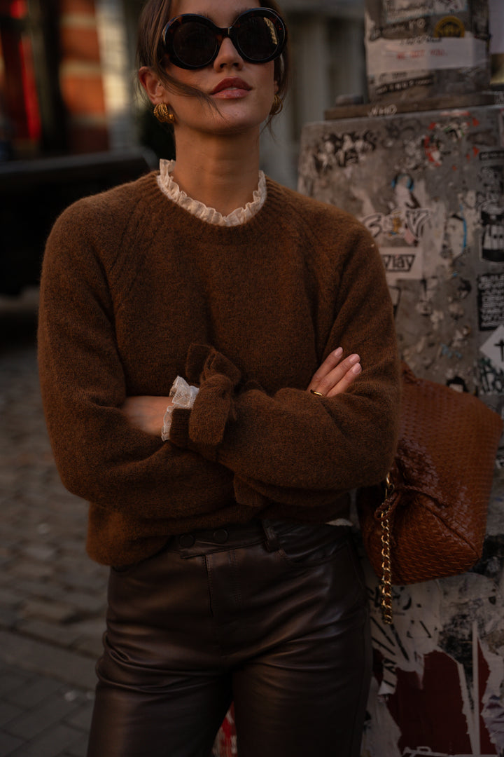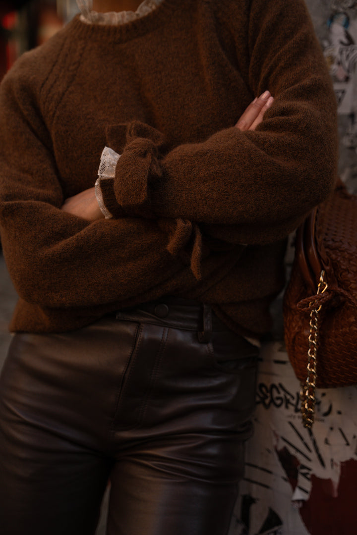 Notre pull Ethan, signature de la Maison, se dévoile cette saison, plus chaleureux que jamais. Sa maille mocha allie douceur et style, tout en conservant ses détails soignés que l'on aime tant : ses manches raglan, agrémentées de tresses tricotées, et son détail unique à nouer en bas de manche.