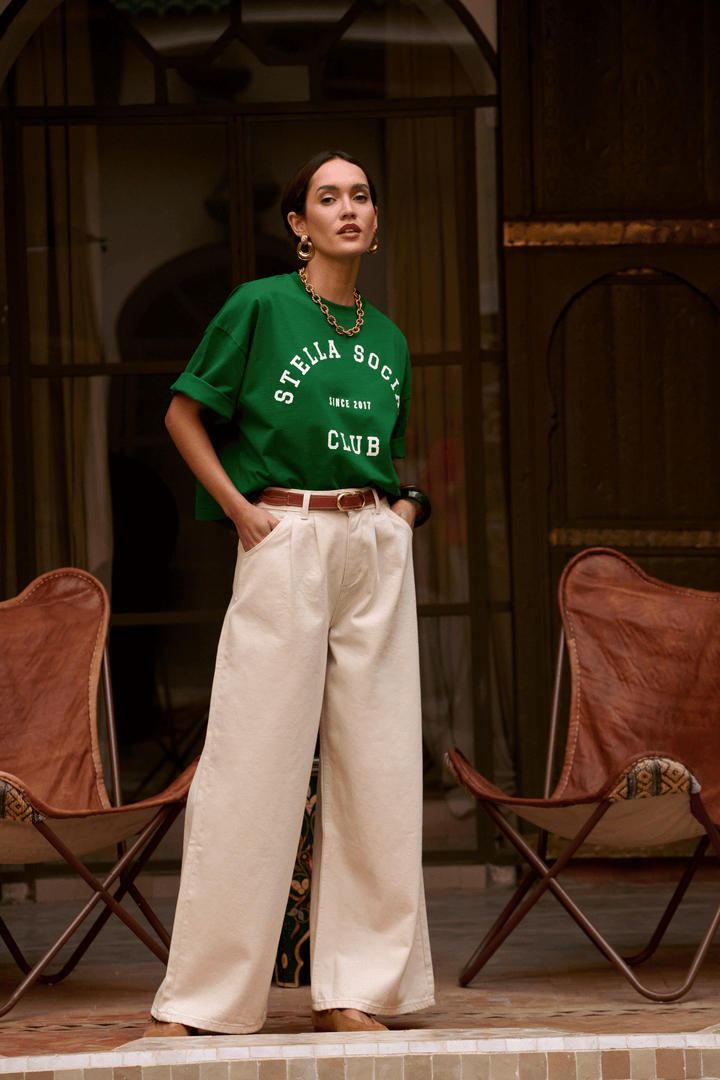 Le T-shirt Stella Club, 100% en coton organique, fabriqué au Portugal, est le nouvel atout mode de votre garde-robe.