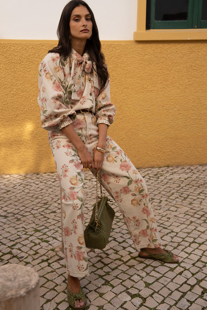 On craque pour le total look fleuri avec le jean Allane. Le tout ponctué de détails vert olive comme les sandales Eva et le sac Cellineta.