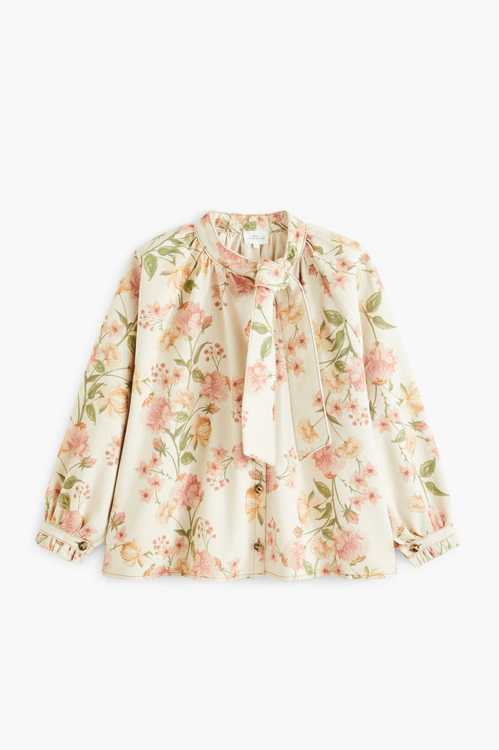 Ce chemisier présente une coupe trapèze et des fronces à l’encolure, apportant volume, légèreté et mouvement à la silhouette. Les manches longues, froncées en tête d’épaule, se terminent par de petits poignets volantés, fermés d’un bouton effet corne. On retrouve une patte de boutonnage légèrement déportée et un col prolongé d’un lien façon col cavalière, à nouer délicatement sur le côté.