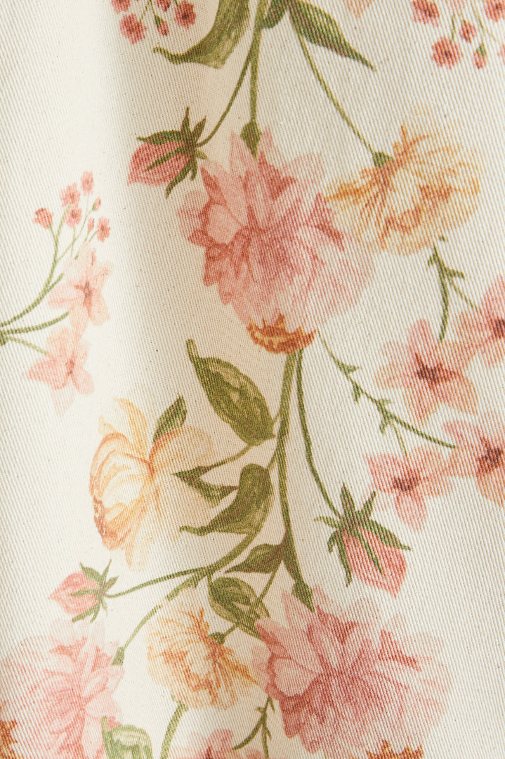Il fait écho aux jardins d'été : des fleurs aux tons doux de rose poudré, terracotta et de touches de vert, sur un fond écru légèrement texturé pour une allure délicatement vintage.