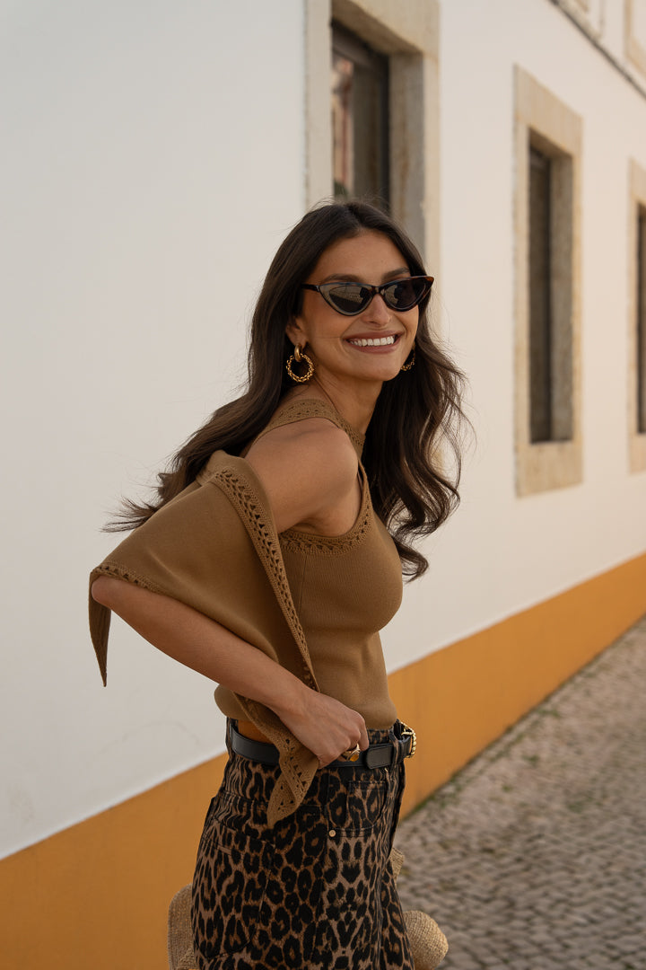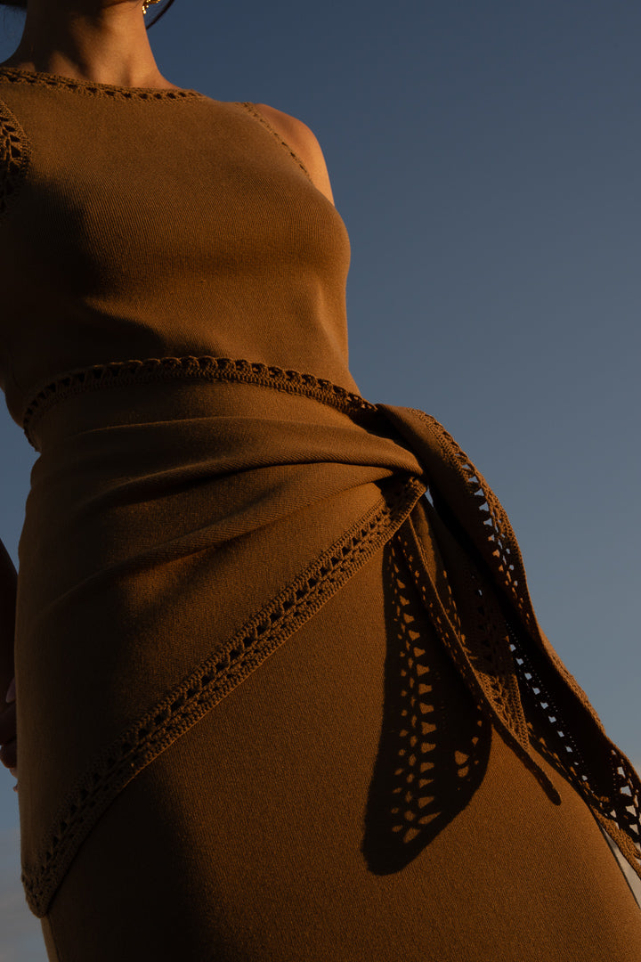 Dans un caramel chaleureux, il a été imaginé pour s’associer parfaitement à la robe Arlette, réalisée dans la même matière.