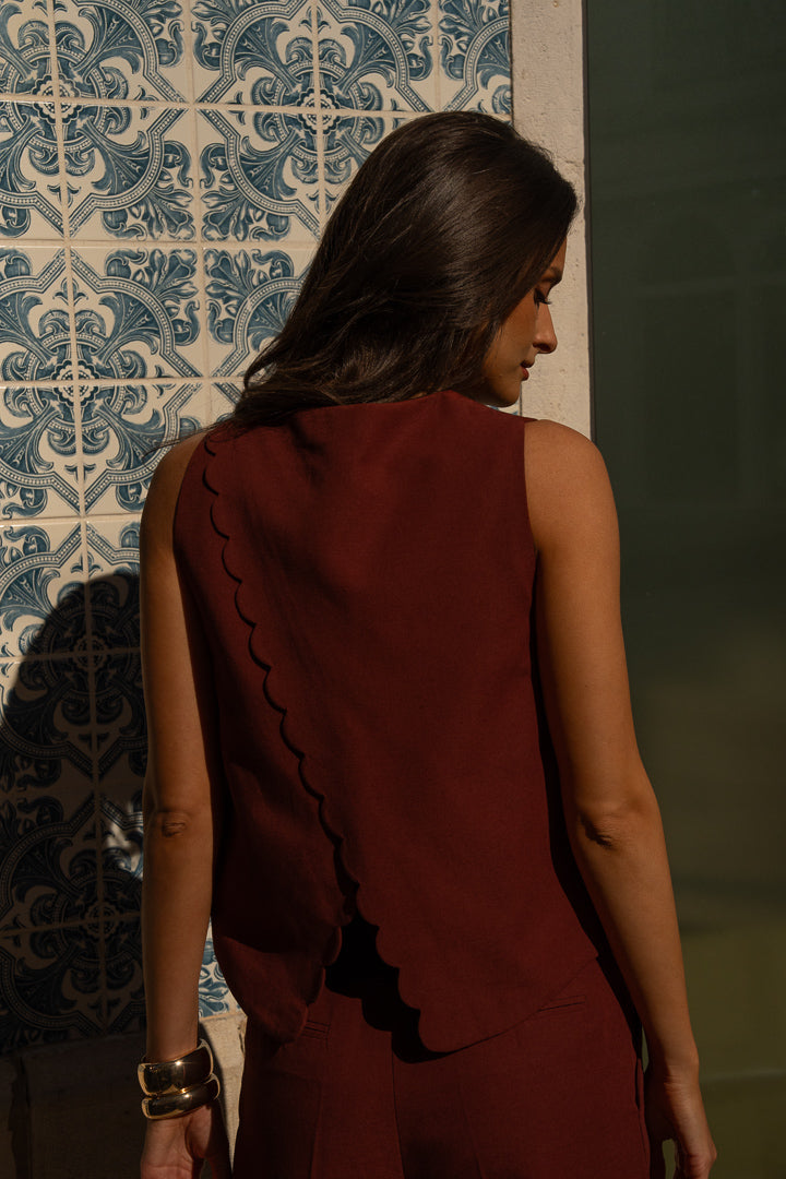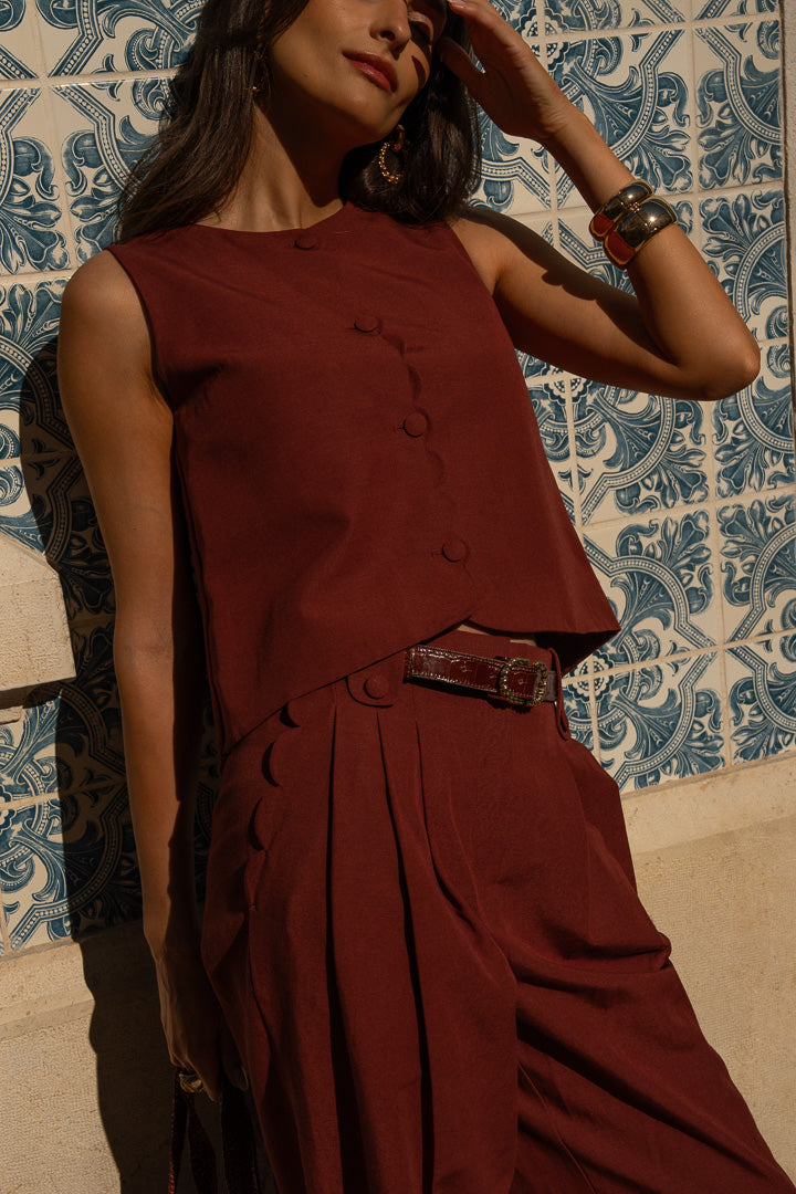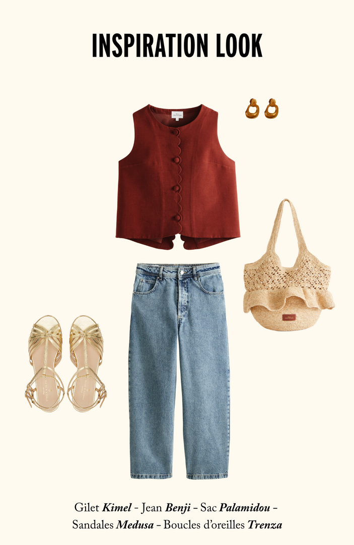 Porté seul sur la peau, associé au pantalon Doris Feston assorti, il compose une silhouette à la fois affirmée et féminine. À porter avec nos sandales Eva en coloris bronze, aussi bien en journée qu’en soirée.