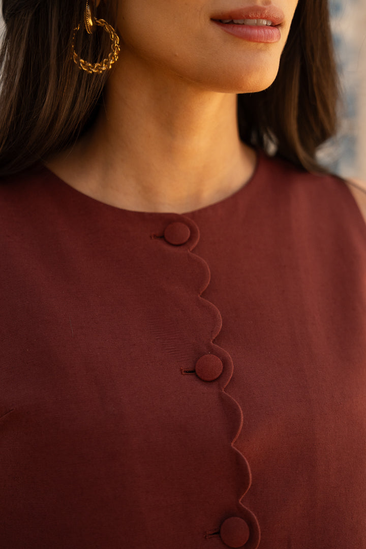Il se distingue par son dos tulipe aux bords festonnés, détail signature qui dessine la silhouette avec subtilité. Sur le devant, une ligne de boutons recouverts vient ponctuer la pièce avec élégance.