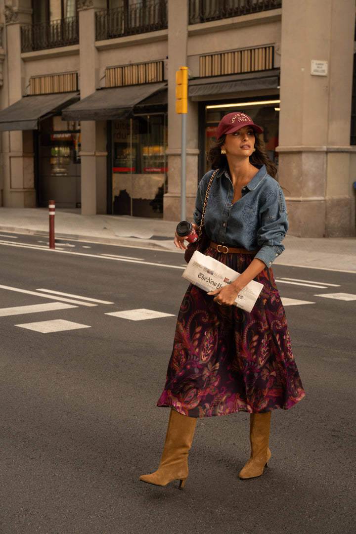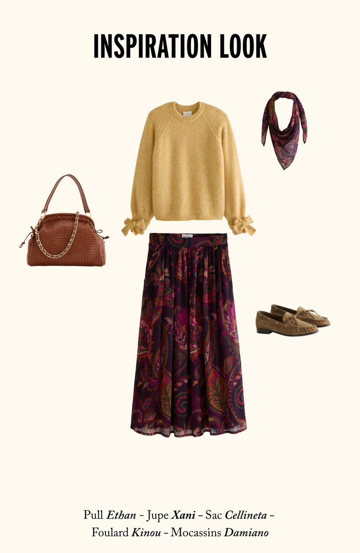 On porte Xani de toutes les façons : avec une chemise en jean pour un look casual, avec le chemisier Richna pour un total look imprimé, ou même avec un t-shirt Felipe pour des looks plus simples du quotidien.