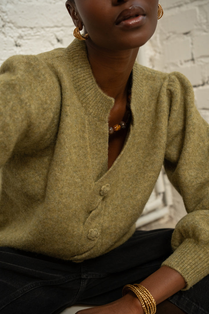 Il se distingue par sa jolie torsade positionnée à l'avant, délicatement sublimée par de faux boutons en forme de petites fleurs tricotées. Sa coupe légèrement courte et ses manches volumineuses lui apportent une allure féminine et tendance.