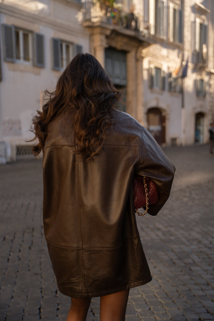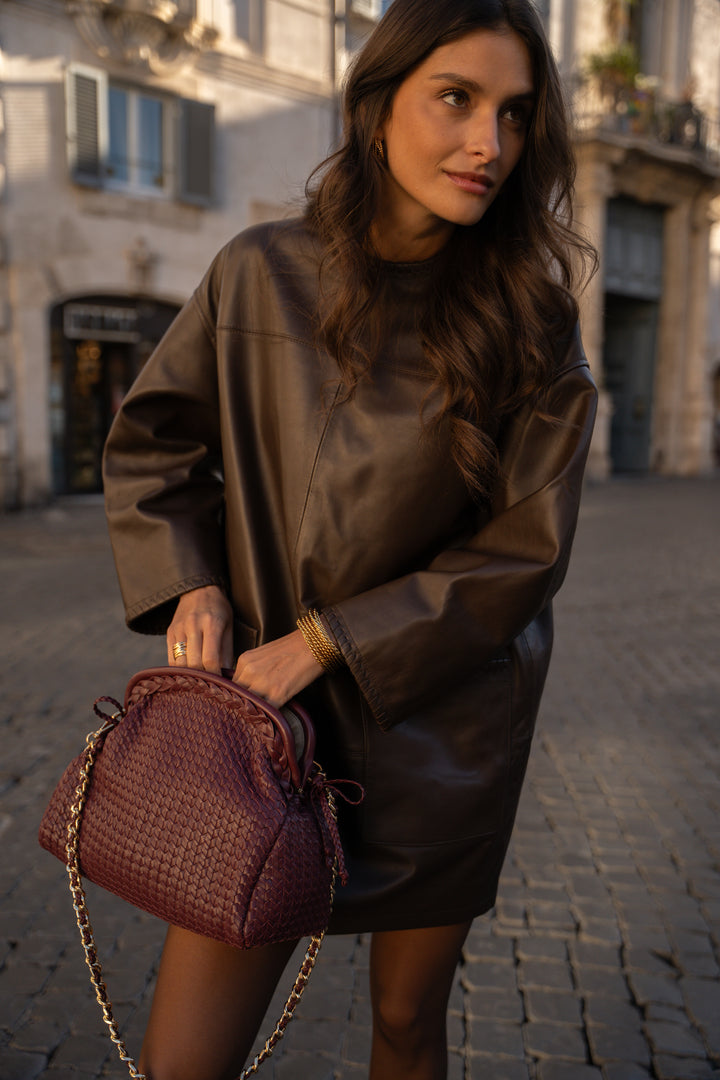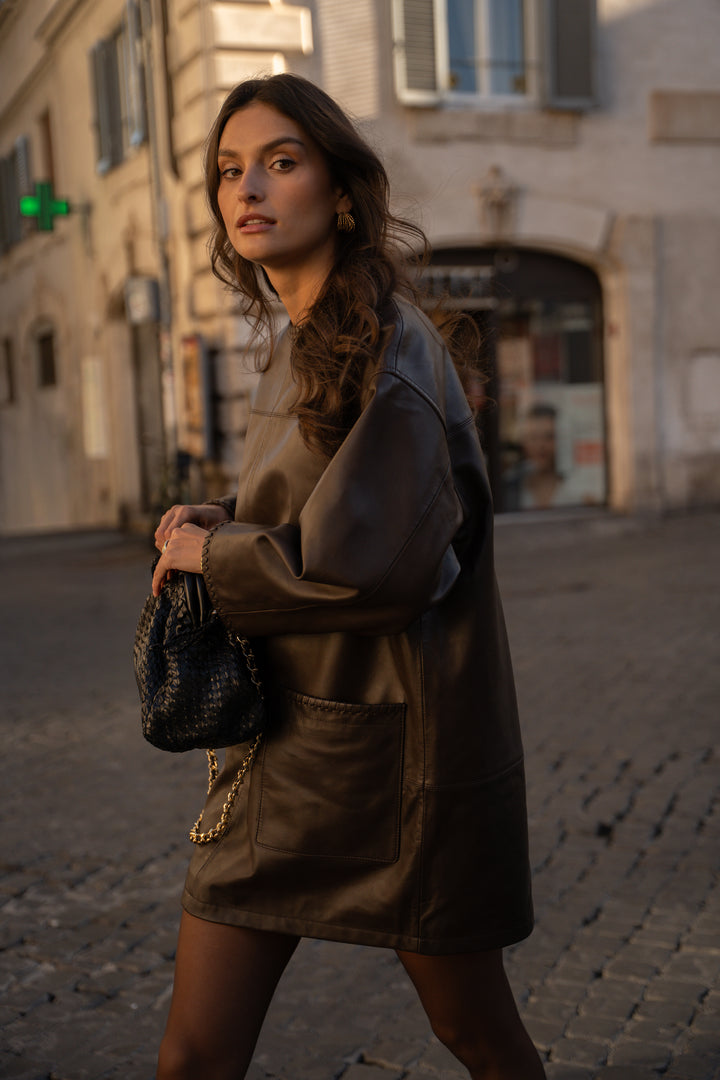 La robe en cuir véritable, Yuna, affirme son style avec une allure moderne et audacieuse.