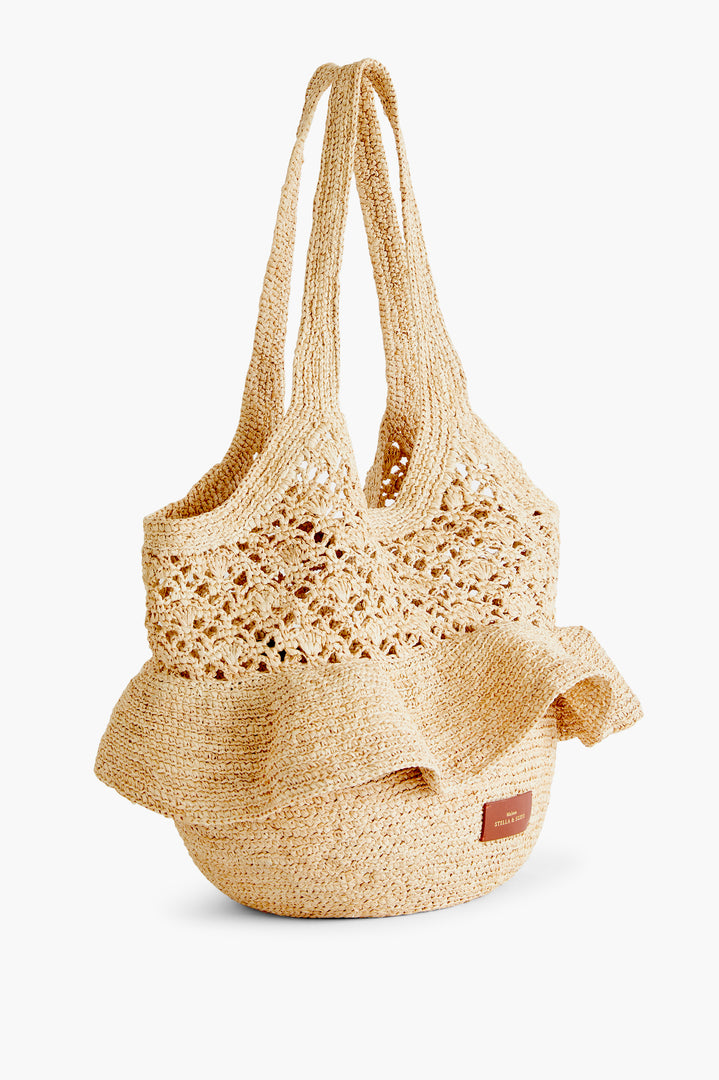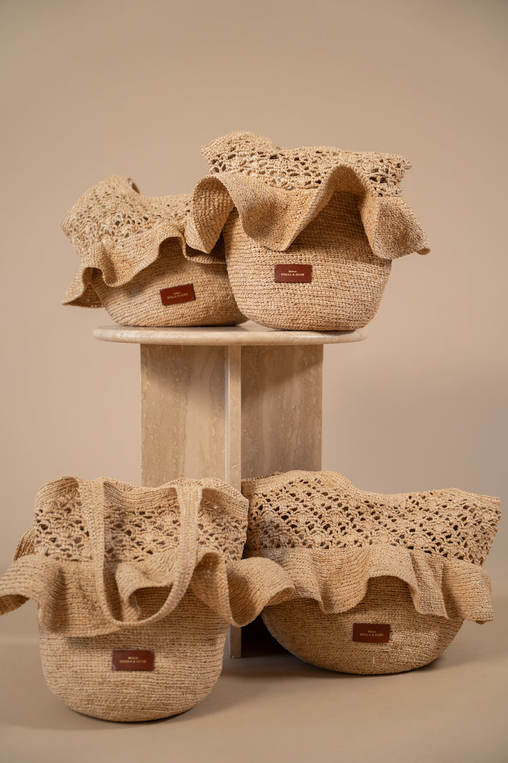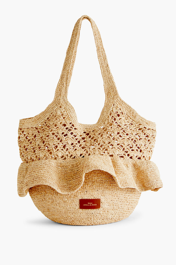 Un large volant vient dessiner la ligne du sac avec mouvement, en écho à l’ADN féminin de la Maison. La pièce est signée sur le devant par un jacron en cuir embossé du logo Maison Stella & Suzie.