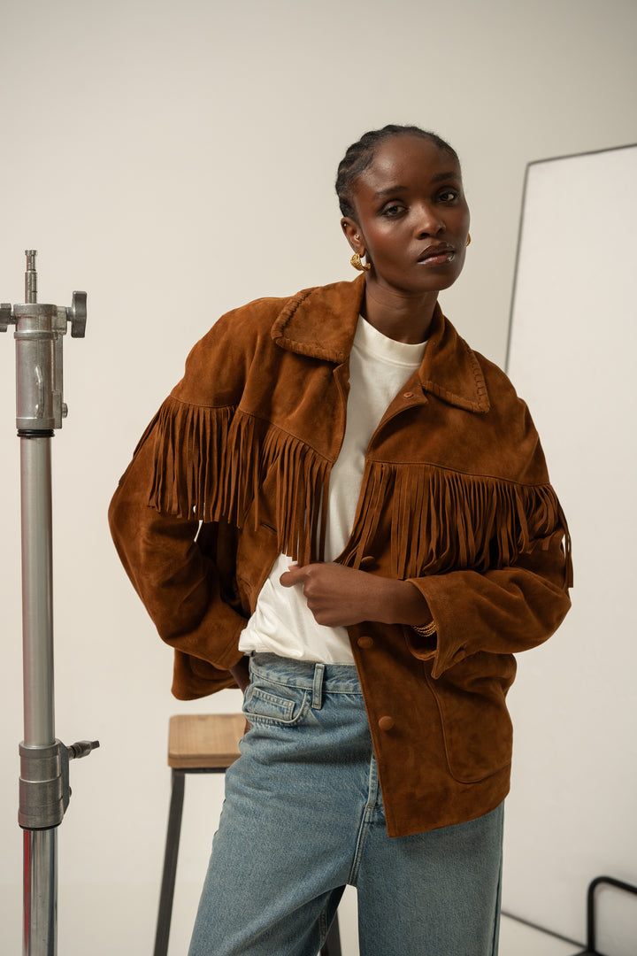 Confectionnée en daim cognac véritable, elle séduit par ses détails bien pensés : des franges iconiques, des boutons recouverts qui se fondent délicatement dans la texture de la veste et des bordures festonnés au col et aux poches. Sa doublure intégrale en viscose en fait une pièce aussi confortable que raffinée, pensée pour traverser les saisons avec allure.