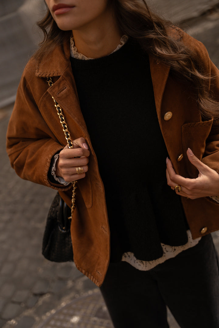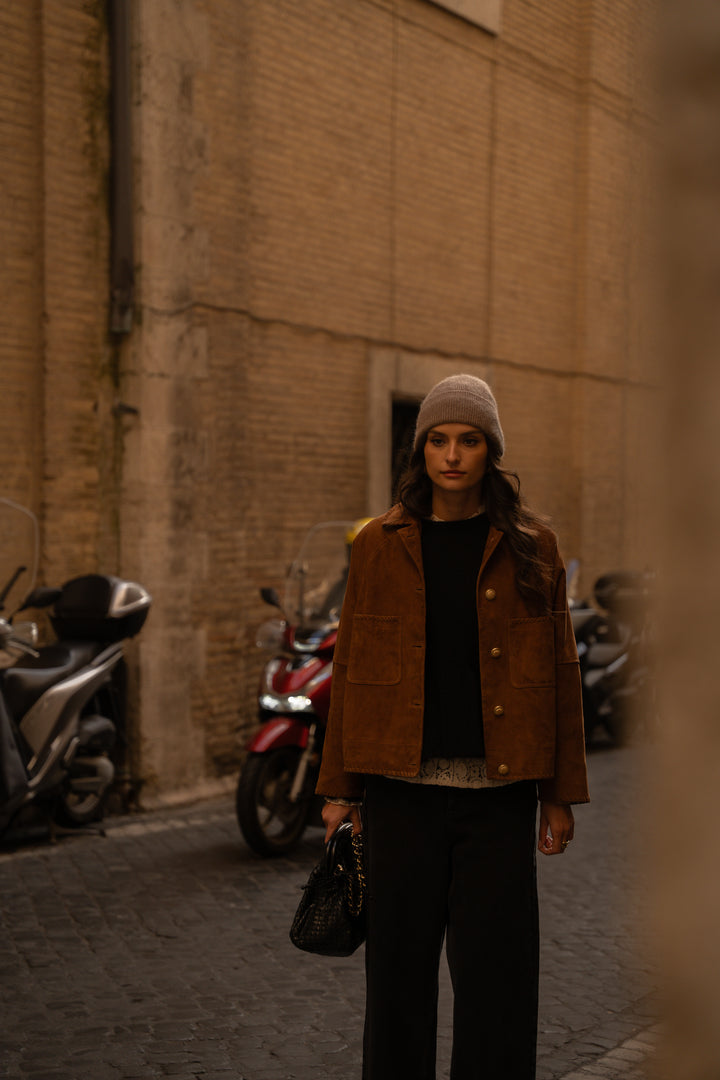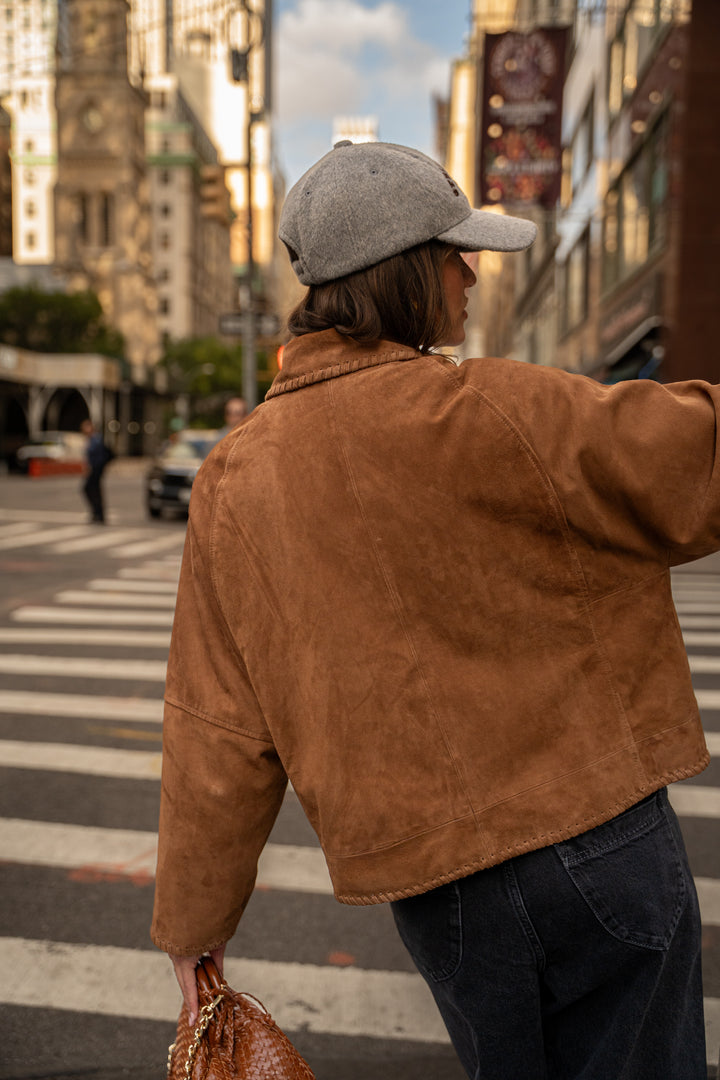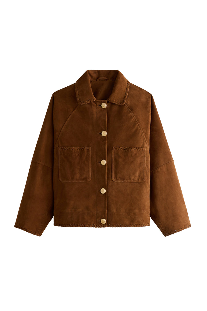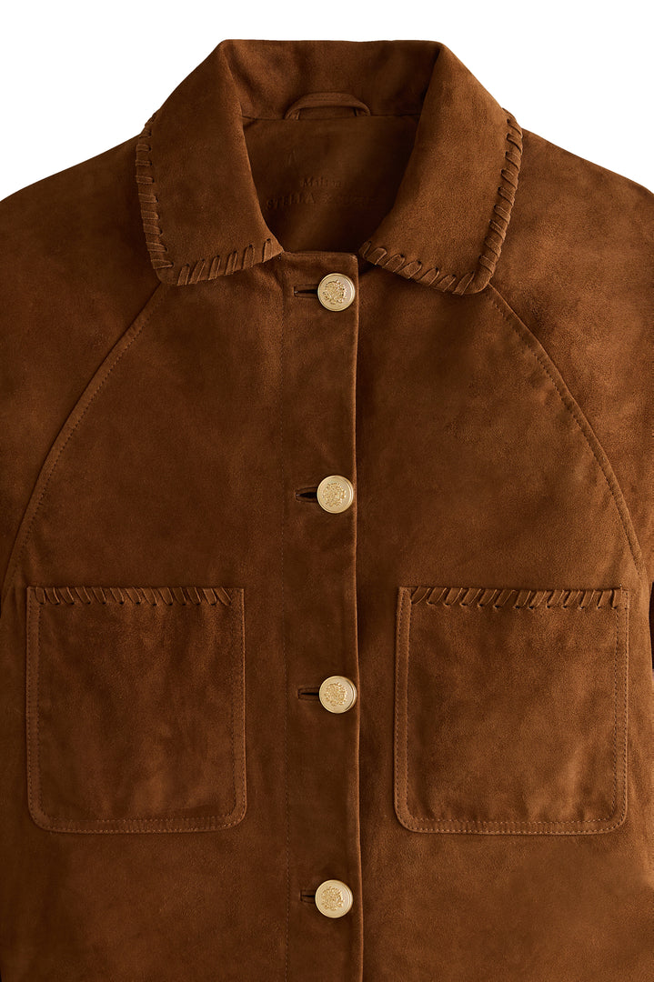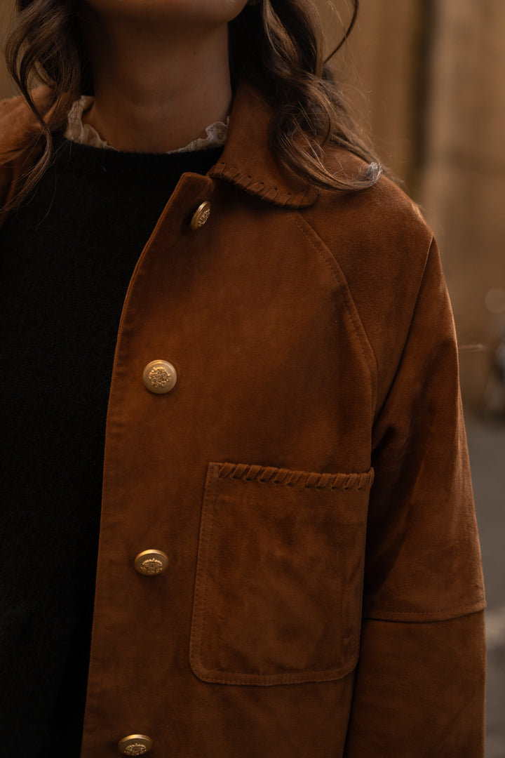 La veste en daim Dion se réinvente cette saison avec de délicates finitions festonnées au niveau des manches, des poches, du col et du bas, pour une touche de féminité unique.